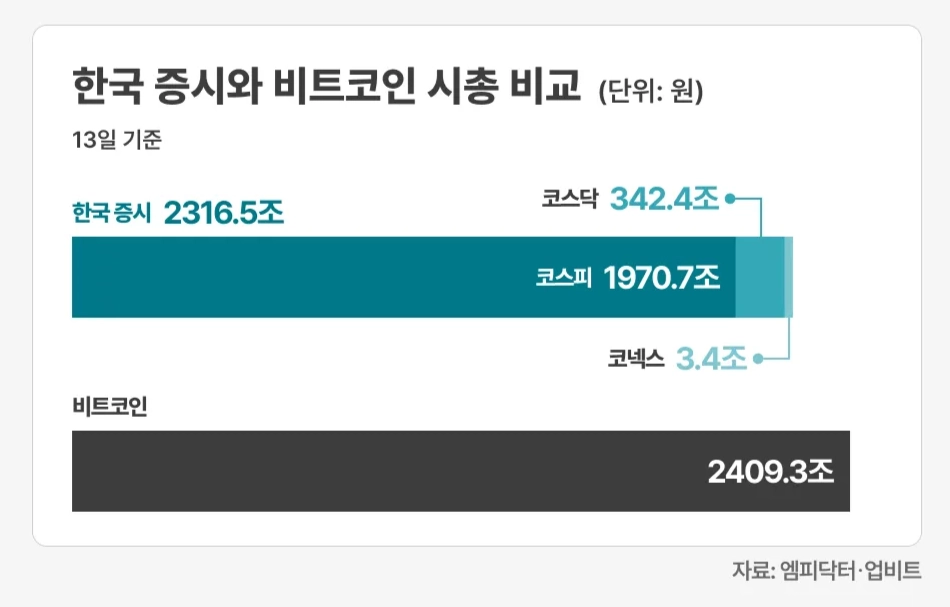 11월 13일, 비트코인의 시가총액은 2409조 3104억 원을 기록하며 코스피와 코스닥, 코넥스 2848개 종목의 시가총액 합인 2316조 5004억 원을 넘어섰어요.