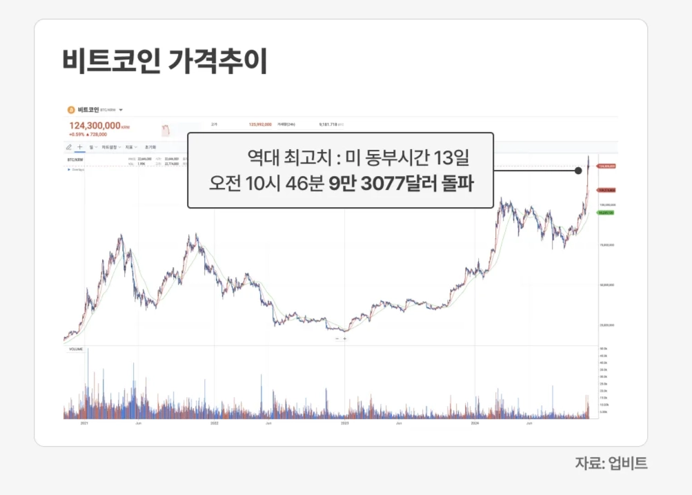 11월 13일(현지시간), 미국 가상화폐 거래소 코인베이스에서 비트코인 1개당 가격은 9만 3000달러(약 1억 3000만 원) 대를 돌파했습니다. 대선 직전인 11월 5일 개당 6만 8300달러에서 거래되던 비트코인이 대선 이후 고점까지 약 35% 오른 거예요.