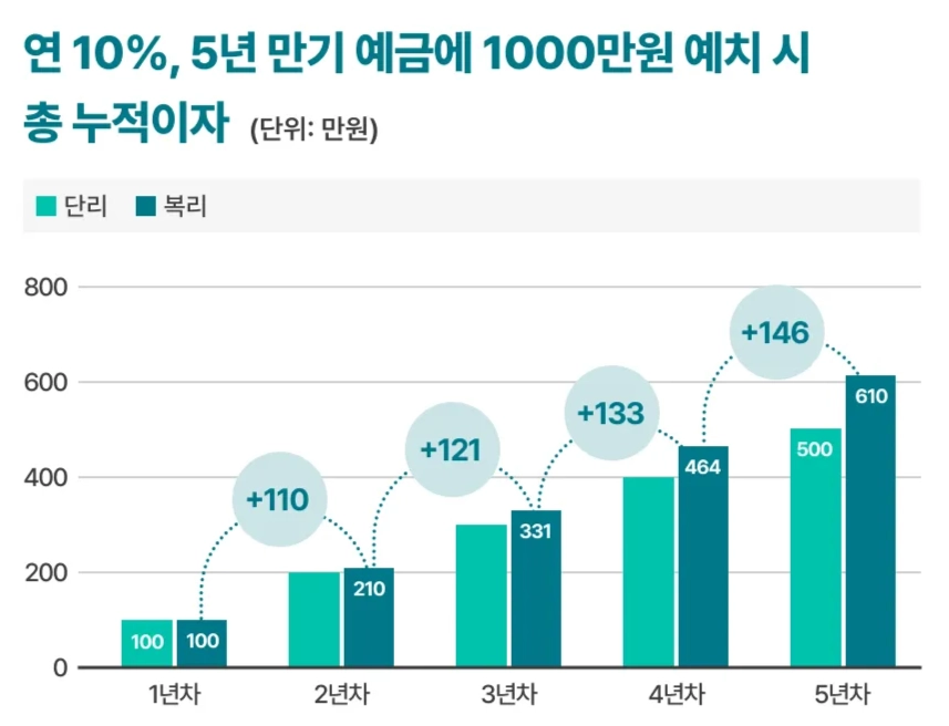 복리는 이렇게 이자에 이자가 계속해서 붙어 돈이 더 빨리 불어나요. 5년 차에는 단리 이자 500만 원, 복리 이자 610만 원으로 두 예금의 이자는 총 110만 원의 차이가 나게 됩니다. 투자 기간이 길어질수록 원리금(원금+이자)은 눈덩이처럼 불어나겠죠.