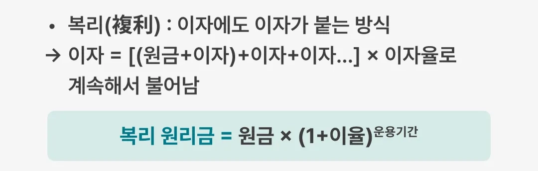 원금과 원금에 대한 이자, 이렇게 불어난 (원금+이자)의 이자까지 계산하는 것을 말해요. 원금에 (1+이율)을 운용기간만큼 곱해서 구할 수 있어요.