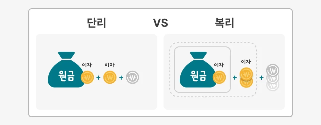 간단히 말해서 원금에만 이자가 붙는 단리와 다르게, 이자에도 이자가 붙는 방식인데요. 이자에 이자가 붙은 금액이 원금이 되어 계속해서 증가하는 데다가, 여기에 계속 이자가 붙기 때문에 단리 적금보다 이자를 더 많이 받을 수 있어요.