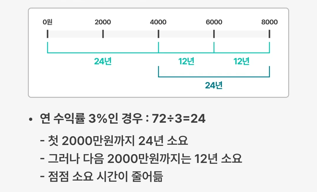 이 72법칙을 내가 원하는 목표 수익률을 정하는데 활용할 수 있어요. 몇 %의 수익률인 투자자산에 투자했을 때 원금의 2배가 되는지 가늠할 수 있기 때문이죠.
