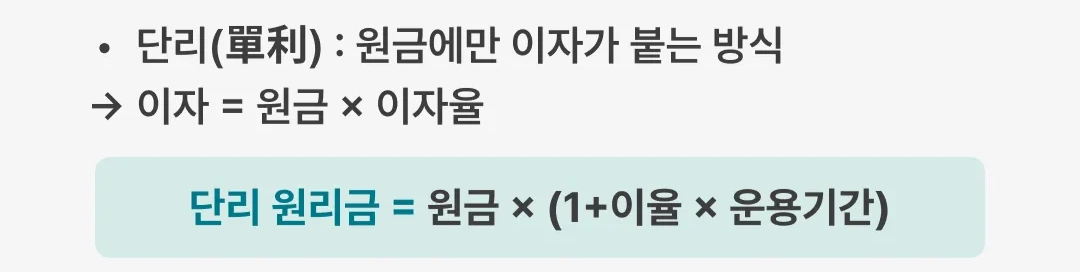 홀 단(單)을 사용하는 단리는 원금에 대해서만 이자가 붙는 것을 말해요.