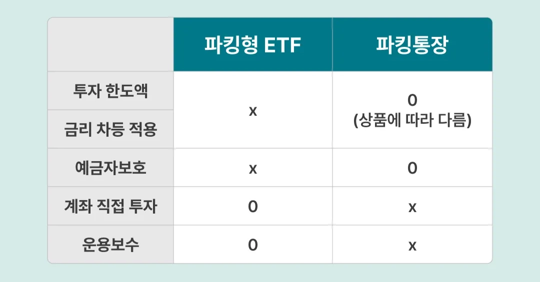 다만 파킹형 ETF의 경우 거래 비용에 따라 수익률에 차이가 있을 수 있으니 파킹통장 수익률과 잘 비교해 봐야 합니다. 파킹통장과 달리 예금자보호가 되지 않는 점도 주의해야 해요. 즉, 원금 손실을 볼 수 있다는 의미죠.
