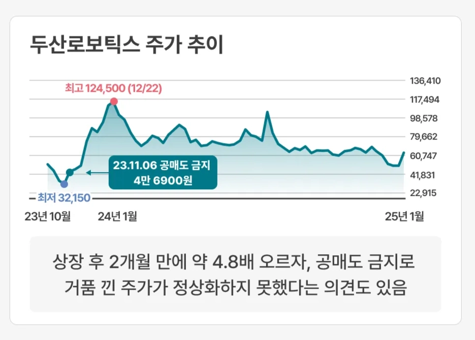 두산로보틱스는 2023년 10월 2만 6000원에 상장했으나 2개월 만인 12월 22일 12만 4500원까지 오르며 고평가 논란에 휩싸였어요. 공매도가 금지되면서 거품이 낀 주가를 정상화하지 못했다는 의견이 있었습니다.