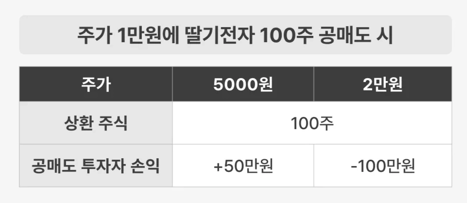 이렇게 공매도의 핵심은 ‘주가의 하락’입니다. 주가가 하락하지 않고 상승한다면 손해를 볼 수 있어요. 딸기전자 주가가 2만 원이 된다면, 상환을 위해 100주를 200만 원을 주고 사야 하기 때문입니다. 주가 상승 시, 제용이는 100만 원의 손해를 보게되죠.