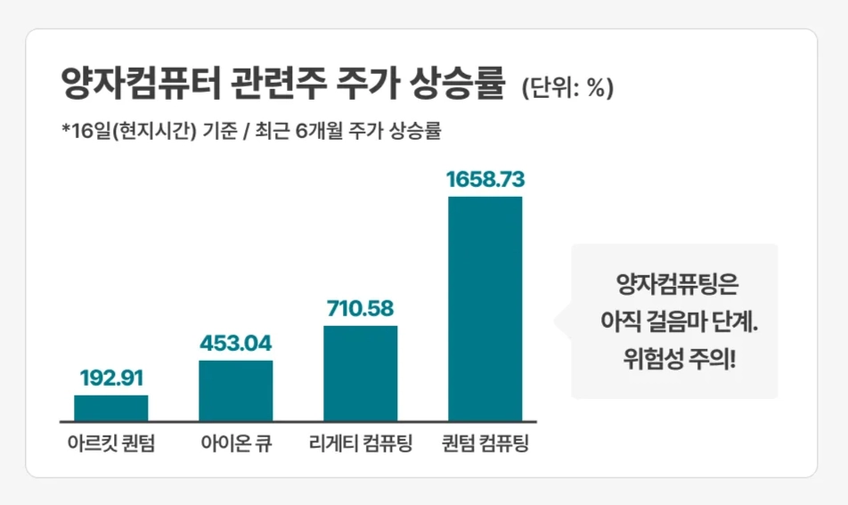 같은 기간 양자컴퓨팅 관련주인 리게티 컴퓨팅 (710%), 아이온큐(453%)도 일제히 상승했어요. 국내에서는 양자 암호 관련주인 엑스게이트가 반년간 약 92% 급등했고요.