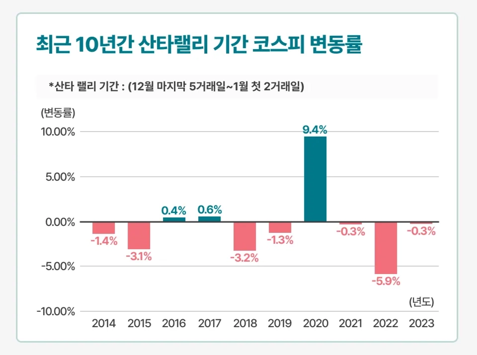 산타 랠리란, 한 해의 마지막 5거래일~새해 첫 2거래일 동안 증시가 강세를 보이는 현상입니다. 크리스마스에 오는 산타클로스에서 따온 용어로, 연말 주식시장이 마치 산타의 선물을 받는 것처럼 상승하는 것을 말해요.