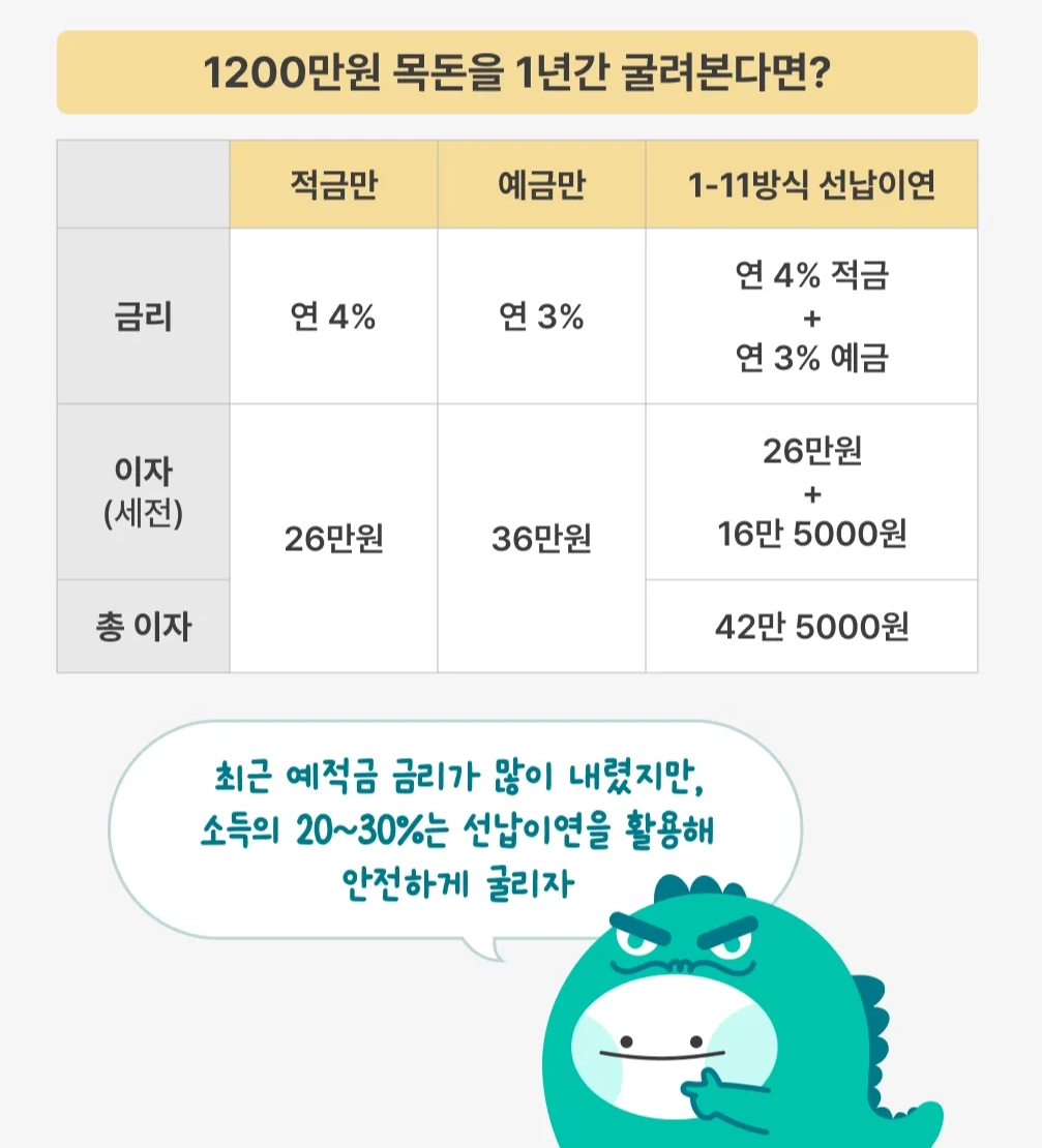 최근 예⋅적금 금리가 많이 내려갔지만, 소득의 20~30%는 예적금으로 안전하게 운용하는 것을 추천합니다. 선납이연을 활용하면 같은 예⋅적금으로도 비교적 높은 수익을 얻을 수 있겠죠?