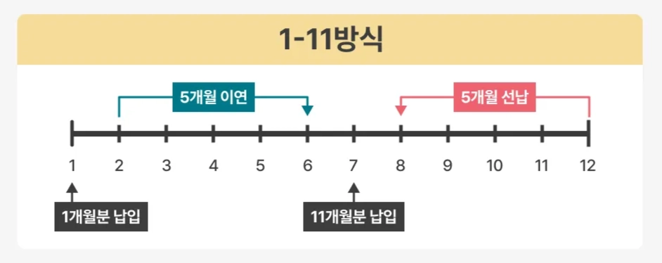첫 달에 1개월 치를 납입하고, 일곱 번째 달에 11개월분을 한꺼번에 납입하는 방법이에요. 목돈이 있는 경우 활용하기 좋아요.