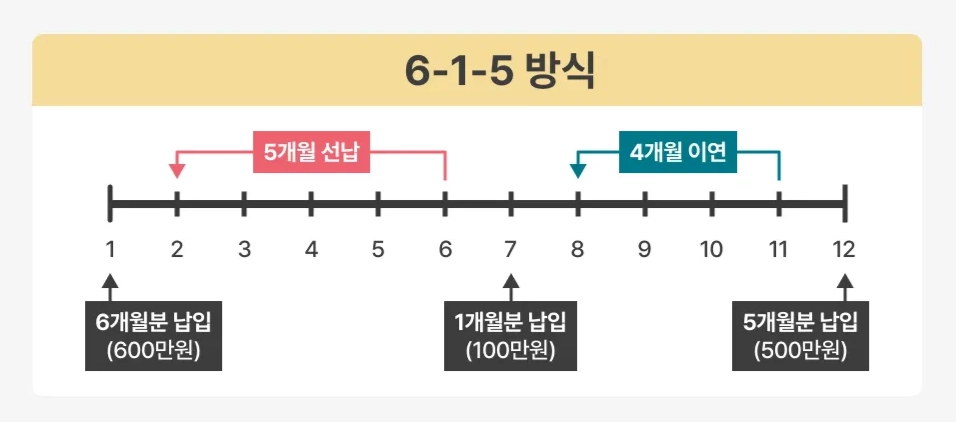 가입한 첫 달에 6개월 분을 납입하고-7번째 달에 1개월 분을 납입- 마지막 달에 5개월 분을 납입하는 방법이에요.