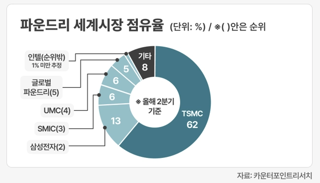 대만 시장조사업체인 트렌드포스에 따르면 TSMC의 올해 2분기 시장 점유율은 62.3%인데 반해 삼성전자는 11.5%로 격차가 50.8%p 벌어졌어요.