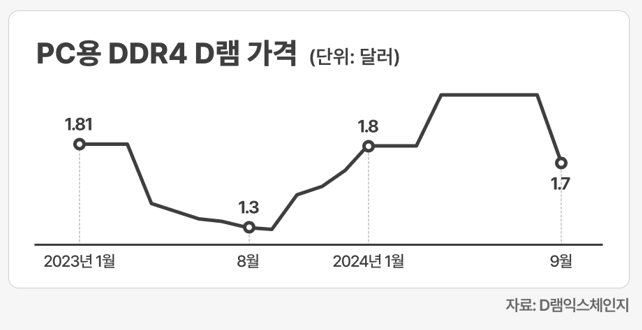 스마트폰⋅PC 판매 부진으로 인해 고객사가 미리 쌓아둔 D램 재고가 소진되지 않으면서 수요가 주춤했어요. 이에 삼성전자의 주력 캐시카우인 D램과 낸드플래시 가격이 지난 9월엔 전달 대비 각각 17.7%, 11.44% 하락했습니다.
