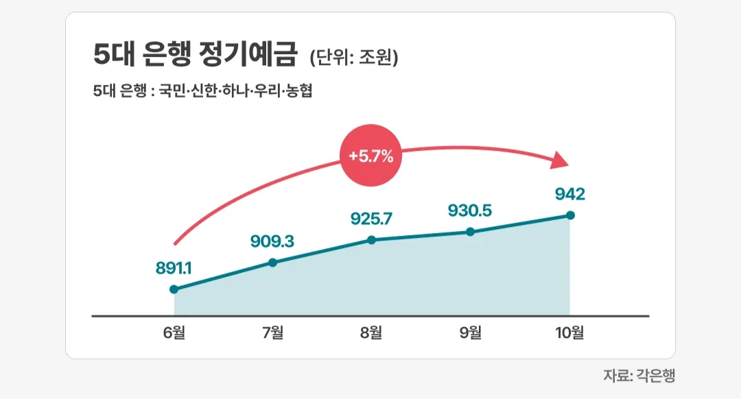 반면 국내 5대 은행(국민·신한·하나·우리·농협)의 정기예금 잔액은 6월 891조 1524억 원에서 지난 10월 942조 133억 원으로 5.7% 늘었어요. 흔들리는 증시 상황에 비교적 안정성이 높은 상품으로 투자자들의 자금이 몰린 거예요.