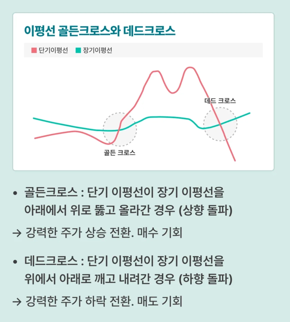 단기 이평선은 시세 전환을 빠르게 파악할 수 있으나 주가의 변동에 민감하게 반응해요. 장기 이평선은 주가의 전체적인 흐름을 파악할 수 있지만 현재 주가 시세를 빠르게 파악하기는 어렵죠. 그래서 장⋅단기 이평선을 함께 고려해 주가의 전반적인 움직임이나 방향성 등을 분석합니다.