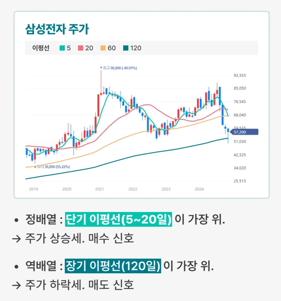 반대로 장기 이평선이 단기 이평선보다 위에 있다면, 현재 하락세가 이어지고 있다는 뜻이에요. 아래로 갈수록 단기 이평선이 위치합니다. 이는 역배열 상태라고 하고, 매도하기 적절한 시점으로 봅니다.