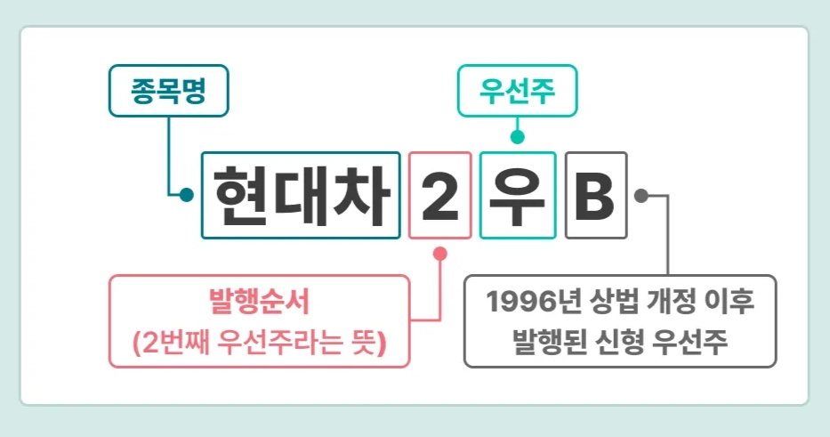이름 뒤에 우가 붙는 우선주는 1996년 상법 바뀌기 전 발행된 구형 우선주이고, 그 이후 신형 우선주는 ‘현대차2우B’처럼 알파벳 B 표시가 들어가는데요. 이는 채권(Bond)의 약자로 배당을 보장해 주는 신형 우선주의 성격이 채권의 성격과 같아 붙은 거예요.