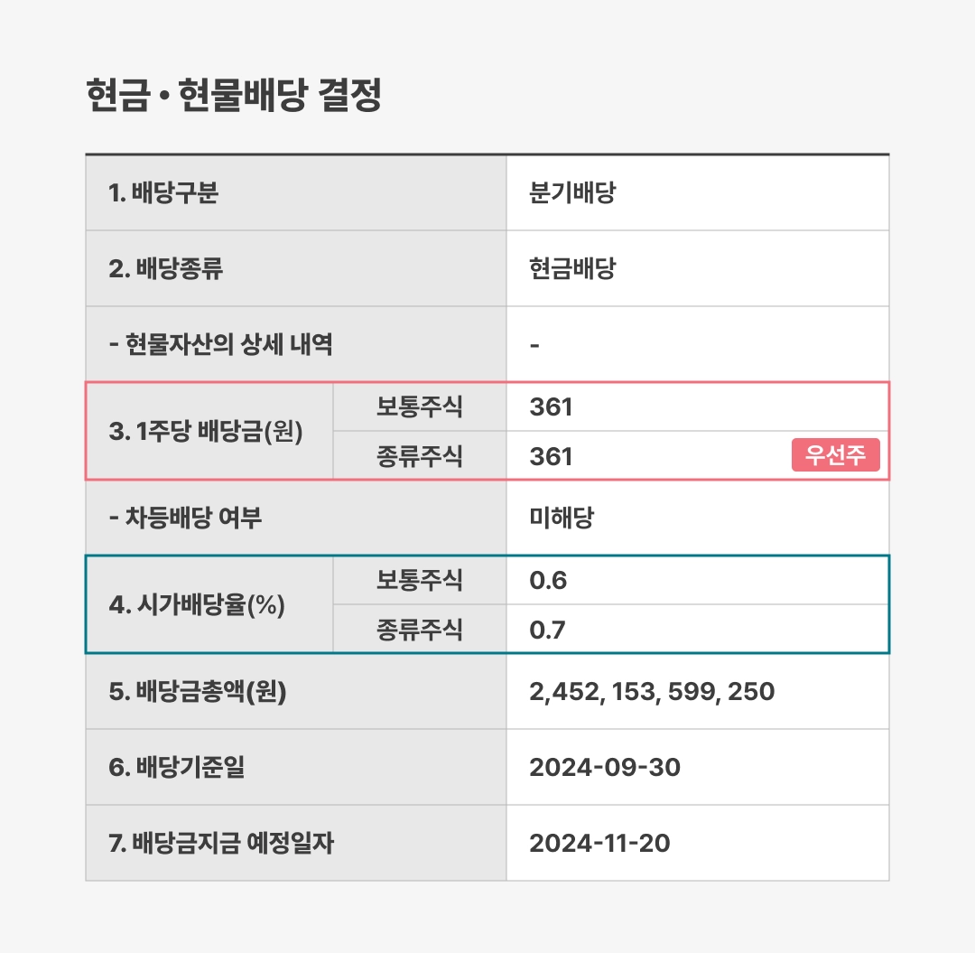 2024년 3분기 기준 현재 삼성전자와 삼성전자우의 배당금을 살펴보도록 하겠습니다. 삼성전자와 삼성전자우의 1주당 배당금은 361원으로 같지만 시가배당률은 보통주 0.6%, 우선주 0.7%로 우선주가 좀 더 높습니다.