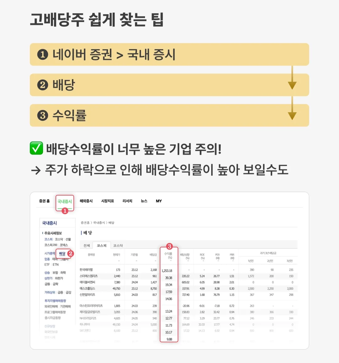 네이버 국내 증시에서 배당 → 수익률을 클릭하면 코스피 배당수익률이 높은 순서대로 나열할 수 있습니다. 배당성향(기업의 순이익 중 배당금으로 지급되는 비율)과 배당 성장률 등 기업 지표를 자세히 확인해보세요!