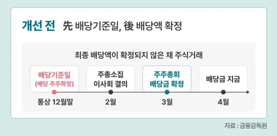 이렇게 배당금액이 정해지기 전 투자를 먼저 하게 되면 내가 얻게 될 이익을 정확히 모르고 투자해야 하는 리스크가 있죠. 깜깜이 배당은 국내 증시가 저평가 되는 이유 중 하나이기도 했습니다. 배당금액이 먼저 결정하고 배당기준일(배당받을 주주가 확정되는 날짜)이 나중에 결정되는 국제 관행과 다른 구조라서 외국인 투자자들의 적극적 투자를 유도하기 어렵기도 했어요.