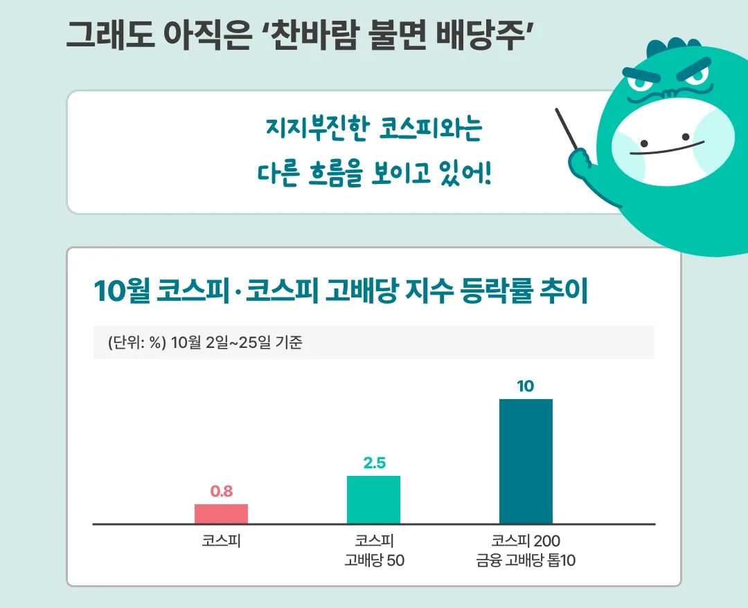 이에 힘입어 배당주 지수는 양호한 흐름을 보이고 있어요. 찬 바람이 불기 시작하는 2024년 10월 2일~25일 기준 코스피는 0.8% 상승했으나 ‘코스피 고배당 50’은 3.8%, ‘코스피200 금융 고배당 톱10’ 지수는 10.2% 상승했습니다.