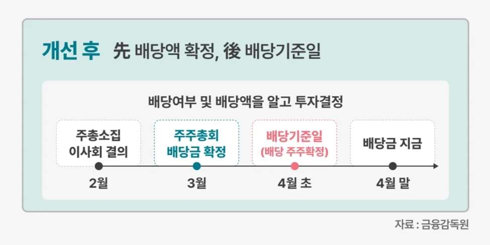 그래서 2023년부터 국제 관행과 동일하게 ‘선(先)배당액 확정, 후(後)배당 기준일 지정’ 제도를 도입했어요. 결산배당 시 기업이 주주총회 의결권 기준일과 배당기준일을 다르게 정할 수 있도록 한거죠. 배당기준일을 12월 말에서 주주총회 이후로 미룰 수 있게 되면서, 기존과 달리 기업의 배당금을 미리 확인할 수 있게 됐습니다.