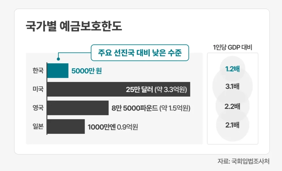 현행 한도인 5000만 원은 20여년 전인 2001년의 1인당 국내총생산(GDP) 규모에 맞춰진 건데요. 2023년 기준, 우리나라의 1인당 GDP대비 예금자보호 한도는 1.2배였습니다. 현재 1인당 GDP(3만5570달러,약 4742만 원)가 2001년(1만2000달러, 약 1599만 원)에 비해 3배 가까이 늘었음에도 한도는 그대로 유지되자 경제규모에 맞춰 한도를 늘려야 한다는 지적이 잇따랐어요. 미국, 일본 등 주요 선진국과 비교해봐도 적은 수준이고요.